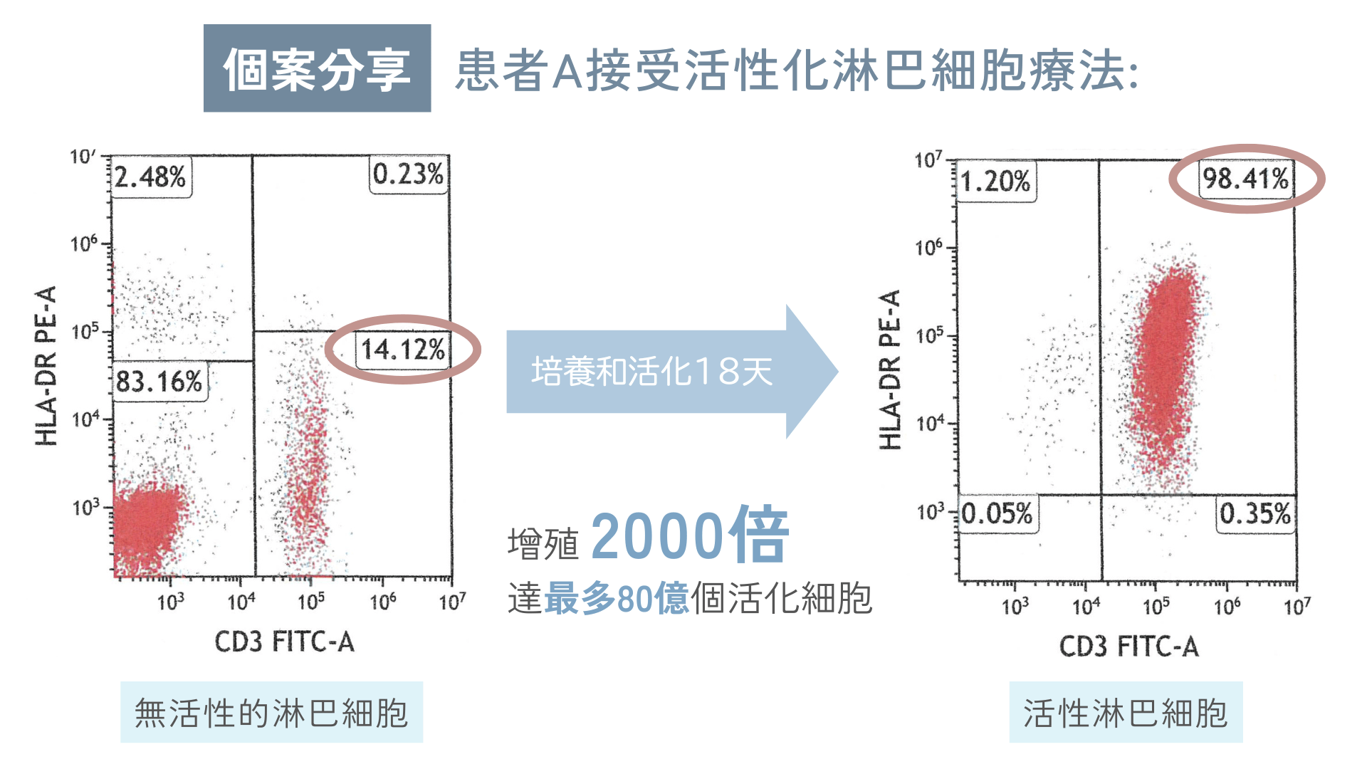 我們的實驗室報告顯示:治療前,T 細胞大多處於疲憊狀態(HLA-DR 低表達);經專業活化後,HLA-DR 表達顯著提升,細胞全面甦醒,重新啟動免疫力。